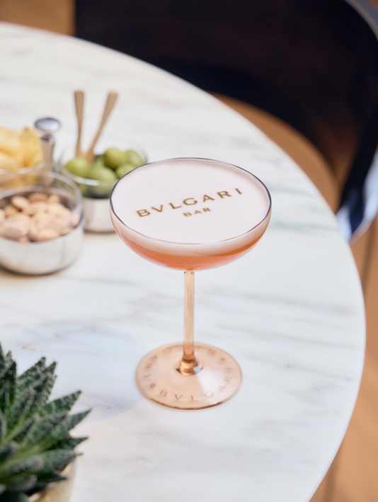 The Bvlgari Cocktail is served in a custom Venini glass; the moody bar (Luigi Fiano)