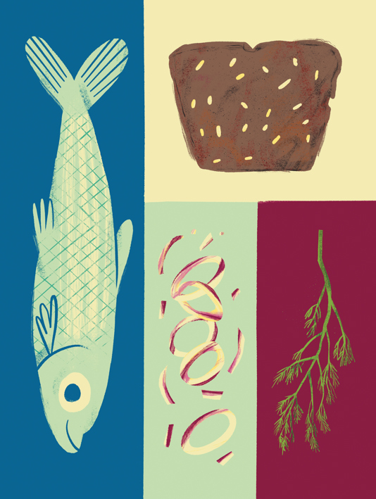 Ingredients: dark rye bread, butter, varied toppings such as pickled herring, liver pâté, cured meats, cheese, eggs and fresh herbs