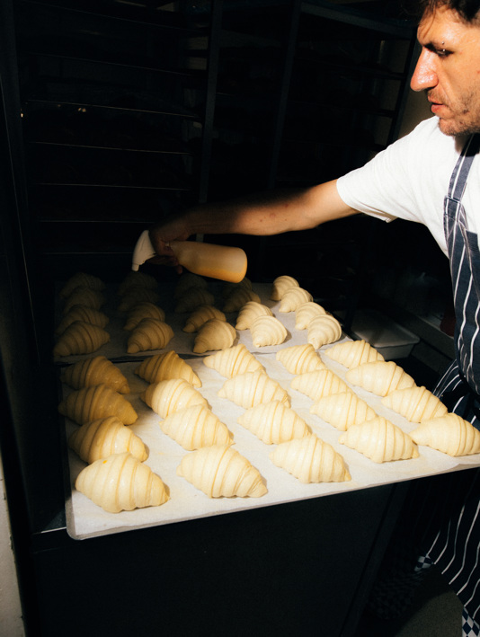 Prepping croissants at Toad Bakery (Aria Shahrokhshahi); West African plates at Chishur