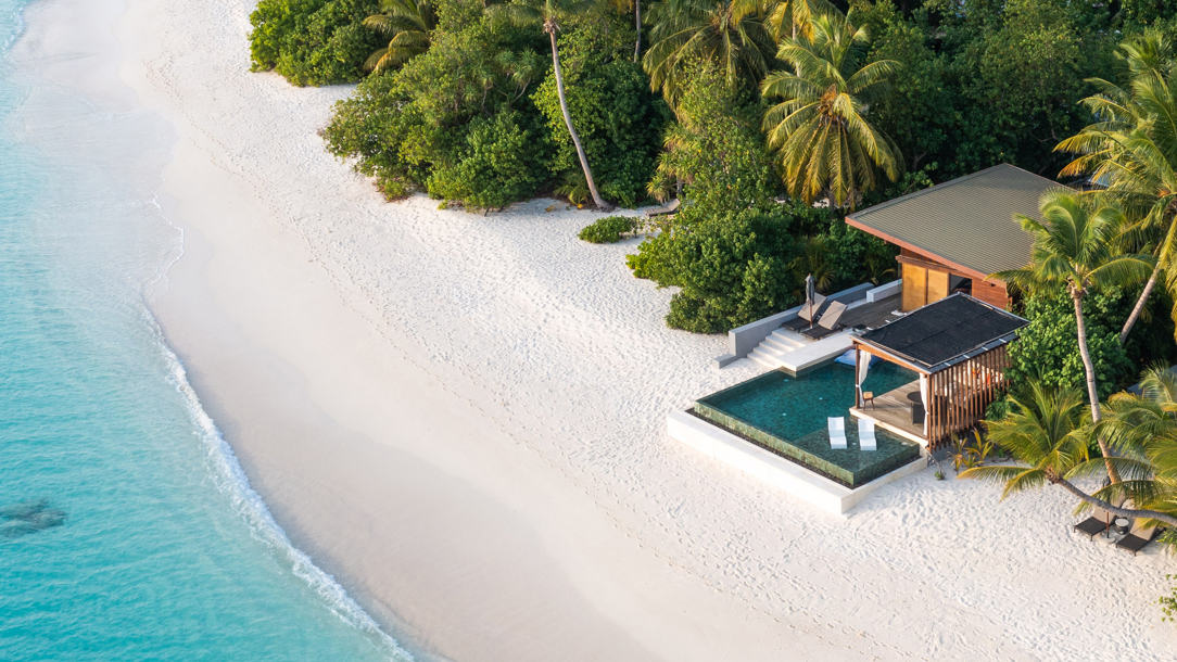 A beach villa with a private pool at Alila Kothaifaru Maldives. Opening image: infinity pool at Park Hyatt Maldives Hadahaa