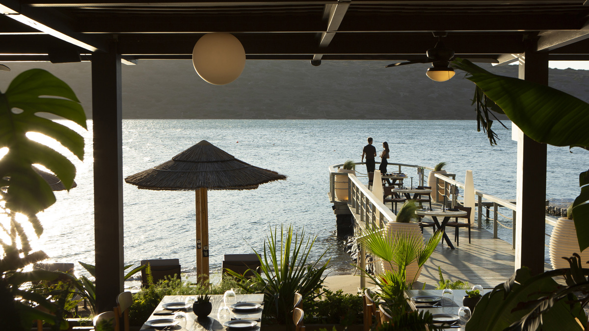 Vilebrequin La Plage restaurant at Domes of Elounda. Opening image: one of the hotel’s five main pools