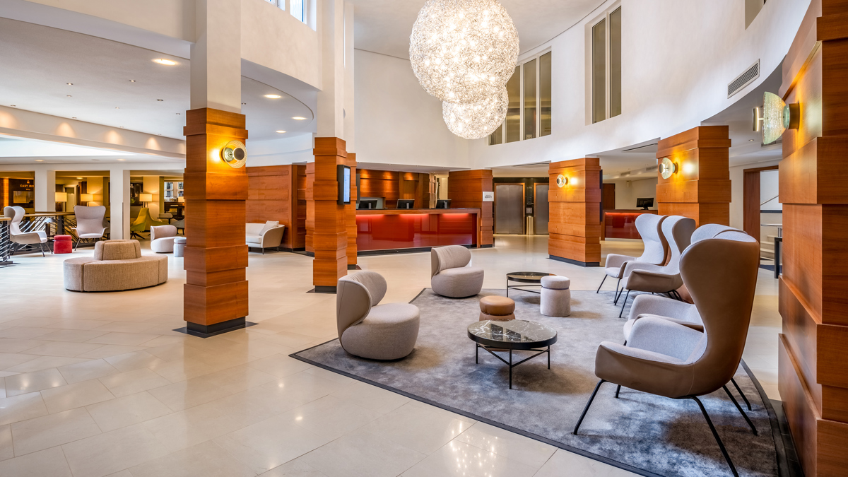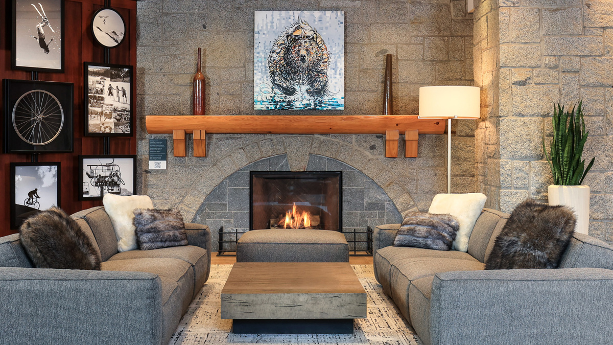 The cosy lobby of The Crystal Lodge, Whistler Hotel