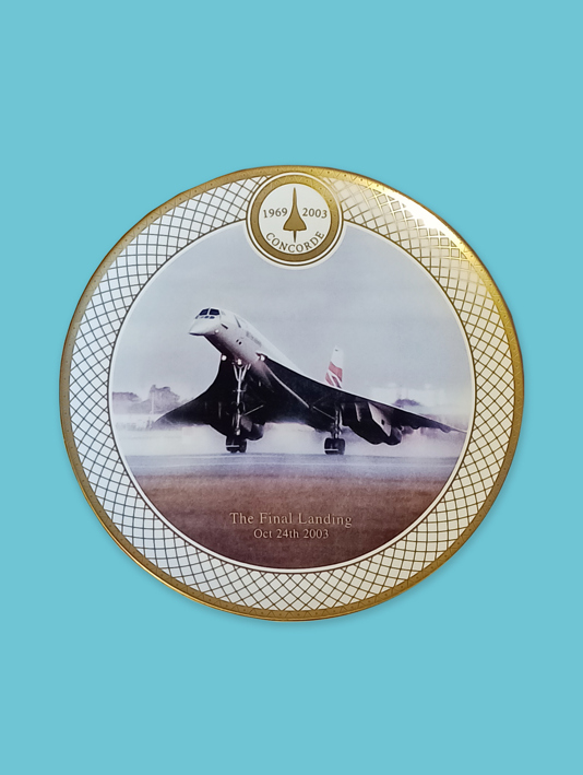 A Royal Worcester plate celebrating British Airways Concorde’s ‘Final Landing’; first day covers commemorating Concorde