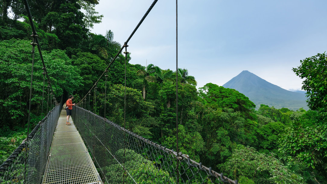 Hiking in Místico Arenal Hanging Bridges Park in La Fortuna. Opening image: the Manuel Antonio National Park coastline