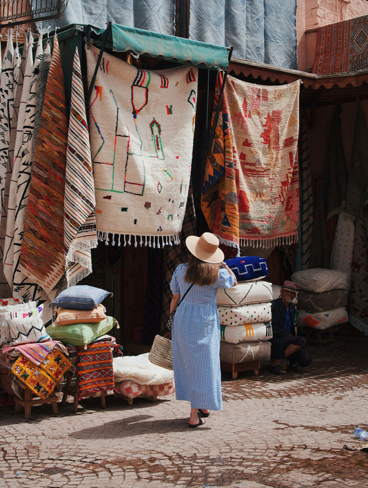Browsing textiles at the Souk El Had, Agadir (Rumman Amin/Unsplash); Plage d’Imsouane near Agadir (Louis Hansel/Unsplash)