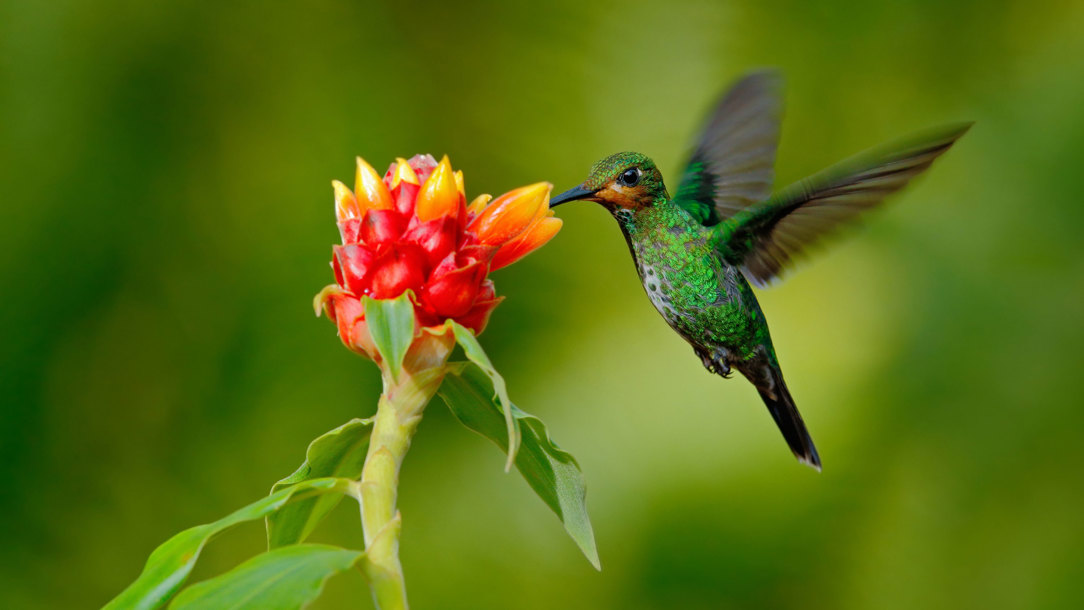 A green-crowned brilliant hummingbird sips nectar from a Costus flower. Opening image: splashing about at Las Chorreras Waterfall