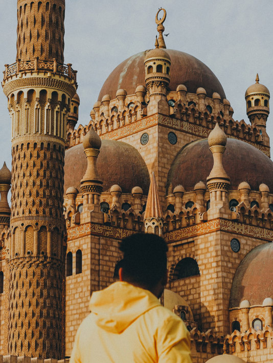 As the air cools, leave the beach behind for Sharm’s Old Market area, which, if you’re familiar with Cairo, is a far cry from the bedlam of Khan el-Khalili market. Here, the shopping cluster spreads out across streets set out in an easily navigable grid (instead of the narrow, at-times intimidating alleyways of the Egyptian capital). Time your visit for the evening call to prayer, which rings out from the minarets of the Al Sahaba Mosque, whose stepped domes and swirling columns glow gold in the evening light.