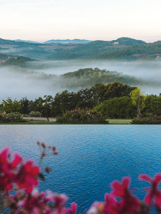 Castello di Casole, a Belmond Hotel, sits in immaculate grounds; the hotel’s infinity pool with views of the surrounding vineyards and mist-shrouded hills