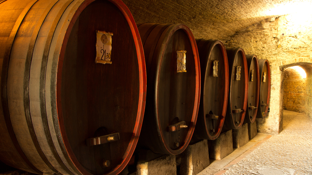 Wine ageing in barrels in a cellar at Borgo Machiavelli