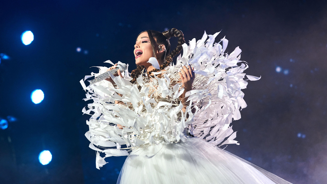 Ariana Grande performing on stage for the movie Don’t Look Up