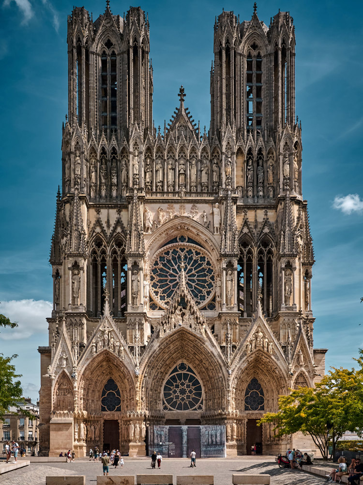 The site of 25 coronations of the kings of France, Reims cathedral dates from the 13th century and is adorned with more than 2,300 statues, including Anges au Sourire (Smiling Angel) and statues of angels with open wings.