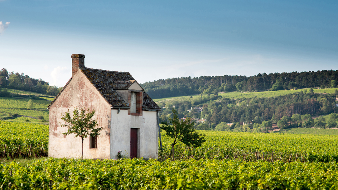 A traditional cabotte stone house surrounded by vineyards in the Côte de Beaune