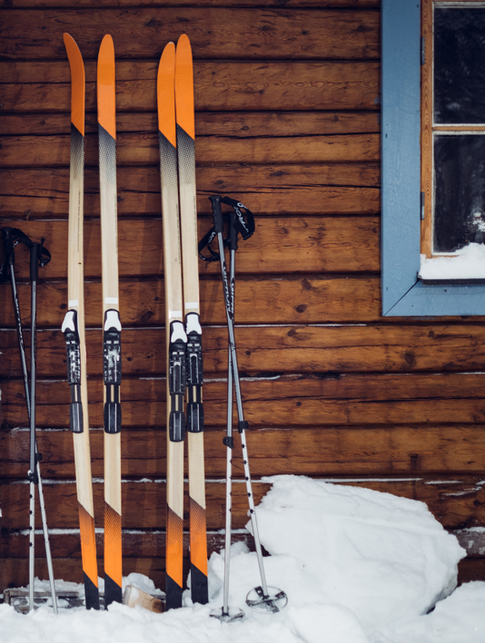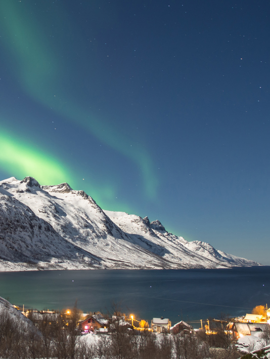 The northern lights above the village of Ersfjordbotn, near Tromsø; skis primed for exploration