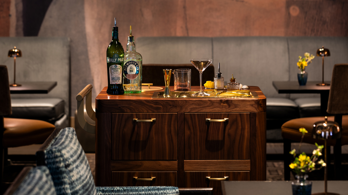 A martini cart in the Martini Lounge at The Knickerbocker Hotel