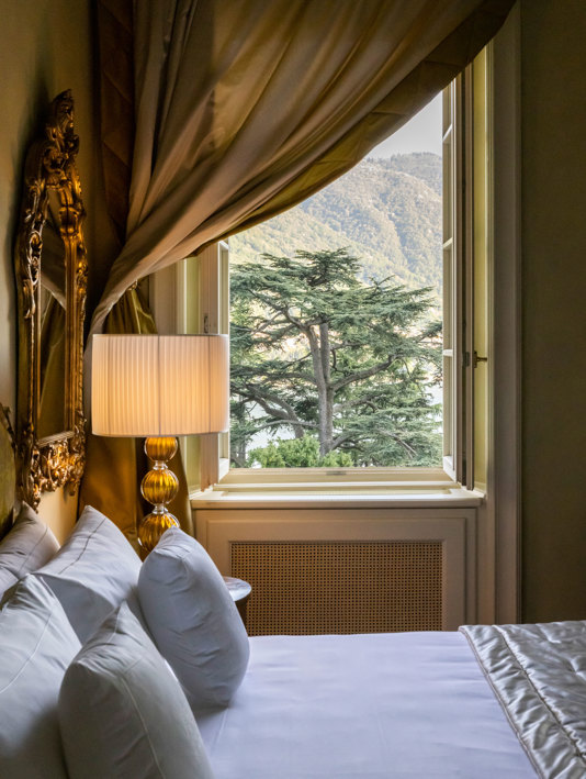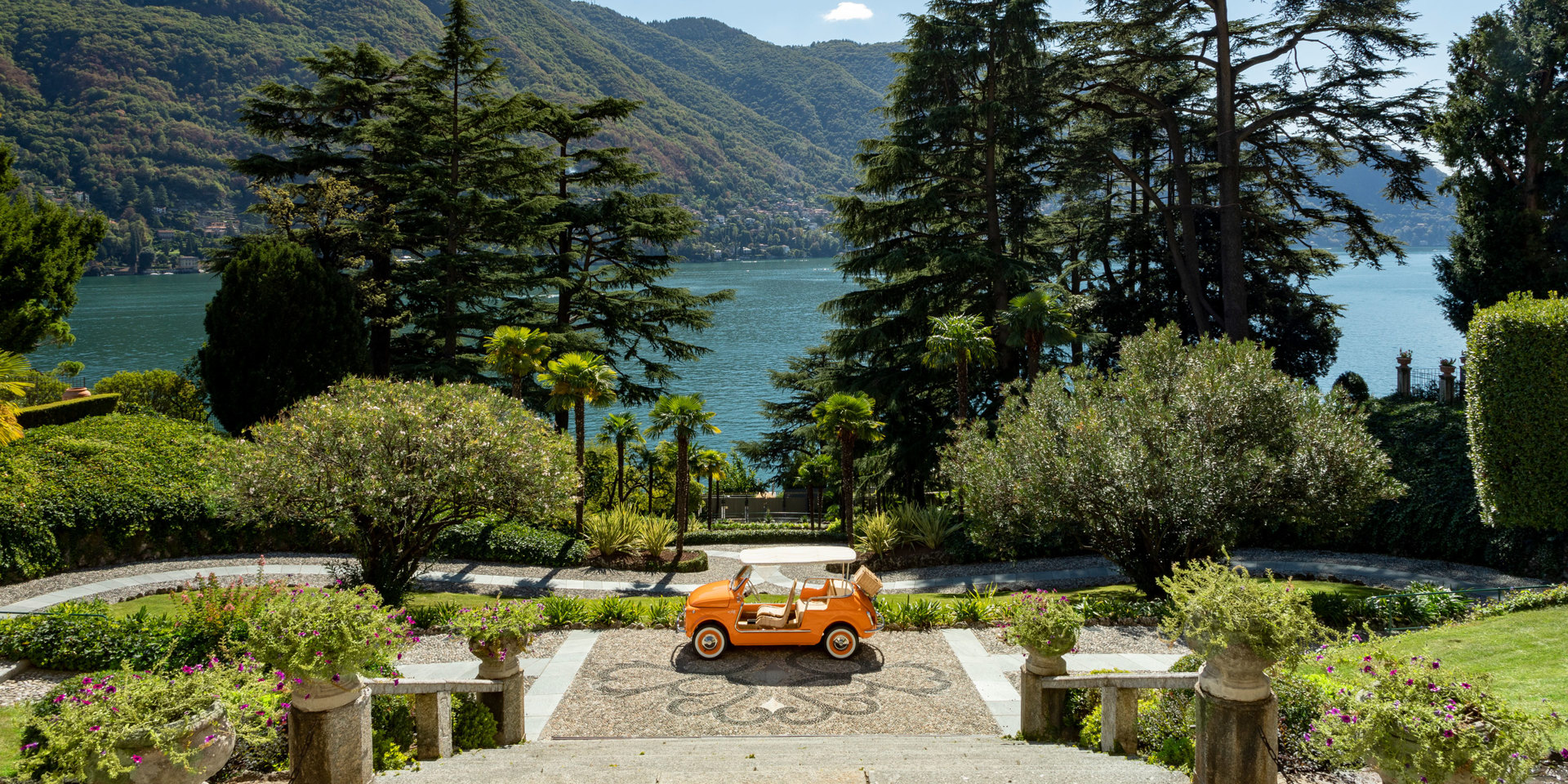 Swimming pool at the Passalacqua (Ricky Monti); a room with a view in the 18th-century private villa (Enrico Costantini). Opening image: a vintage Fiat 500 in the hotel grounds (Ruben Ortiz)