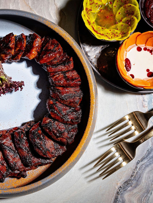 Grilled Wagyu short rib suya at Dōgon by Kwame Onwuachi in Salamander Washington DC; a guest room at the hotel (Matt Dandy)