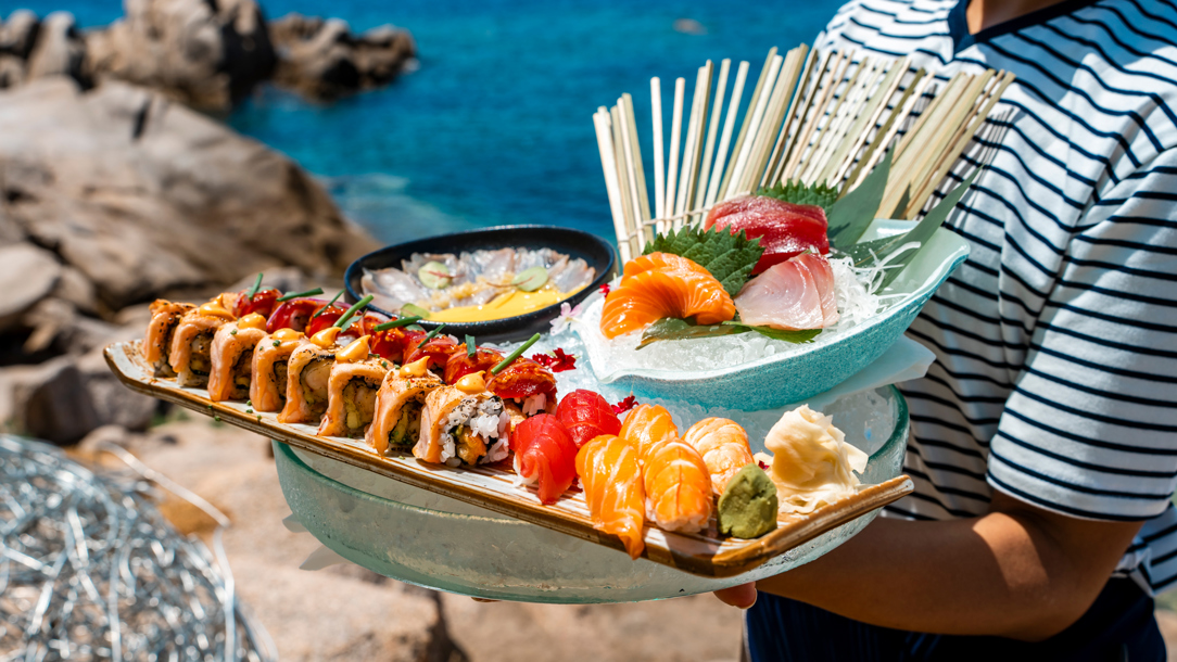 A mouthwatering platter of sushi and sashimi from NAMMOS Baja Sardinia. Opening image: Nikki Beach Ibiza does what it says on the façade