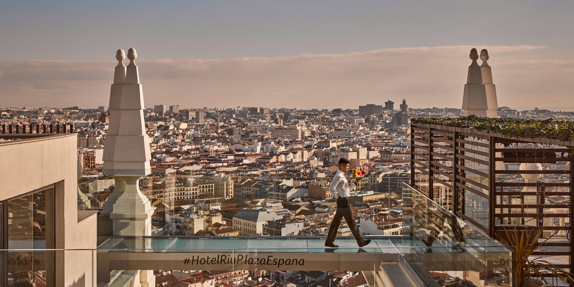 The rooftop pool and terrace at Hotel RIU Plaza España. Opening image: the hotel’s glass walkway