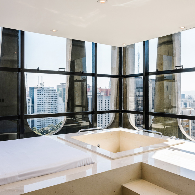 Located 22 floors up, the Presidential Suite at this inner-city hotel offers stunning vistas of downtown São Paulo, framed dramatically by concrete reinforcements on the building’s exterior. While the room is a picture of serenity featuring cream linens, warm woody tones and sultry lighting, the bathroom is fabulous, decked out in gleaming marble with a tub next to the windows so you can luxuriate while admiring the skyline.