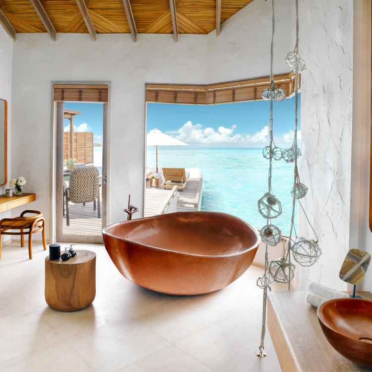 The USP of this bucket-list hotel is undoubtedly the view from its Water Sunrise villas, where guests wake to cobalt skies and gin-clear waters. Alongside butler service, the villas come with a private plunge pool, wine fridge, Bang & Olufsen music system and, in the bathroom, an over-sized copper bath tub with infinity views of the open sea.