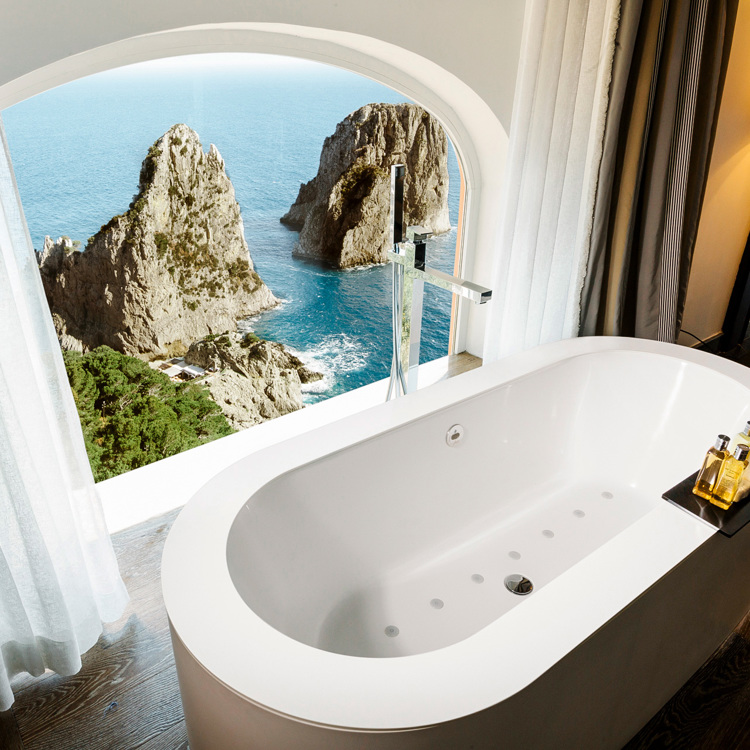 Designed by Le Corbusier, this incredible Capresian property has hosted the likes of President Eisenhower and Winston Churchill, and no two rooms are the same. The Art Suite at Punta Tragara is filled with quirky design notes such as an enormous gilded mirror, warped lamp stands by Promemoria and a free-standing tub facing astonishing views of the Faraglioni rocks and sapphire waters below.