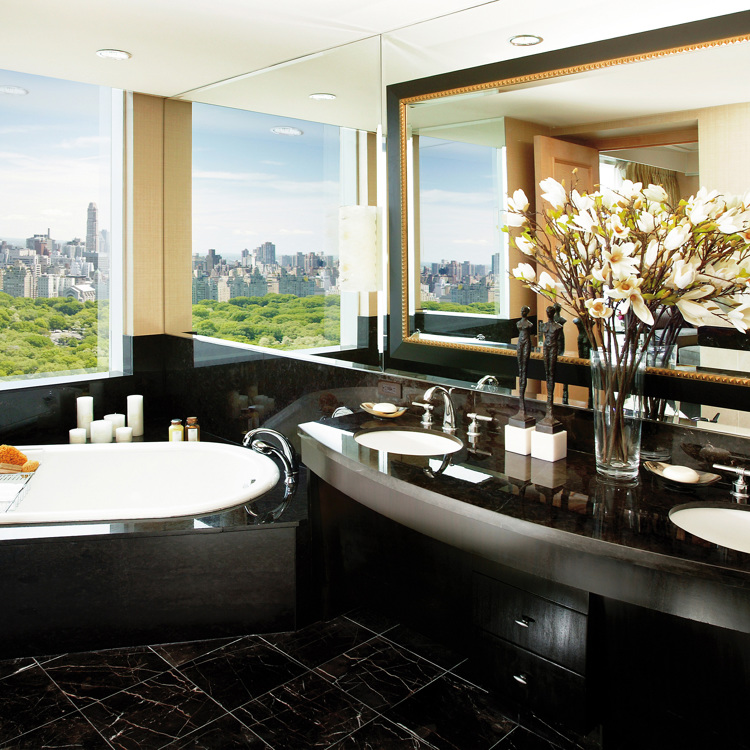 Overlooking Central Park and the Hudson River, the Oriental suite on this luxury stalwart’s 52nd floor is a vision of blue, cream and silver, fitted with a custom designed kitchen unit and a living room with Brazilian Cherry hardwood floors and handcrafted oriental rugs. Coated in sleek black marble, the bathroom looks out on the Big Apple’s iconic cityscape, allowing guests to soak in style while admiring the verdant park below.