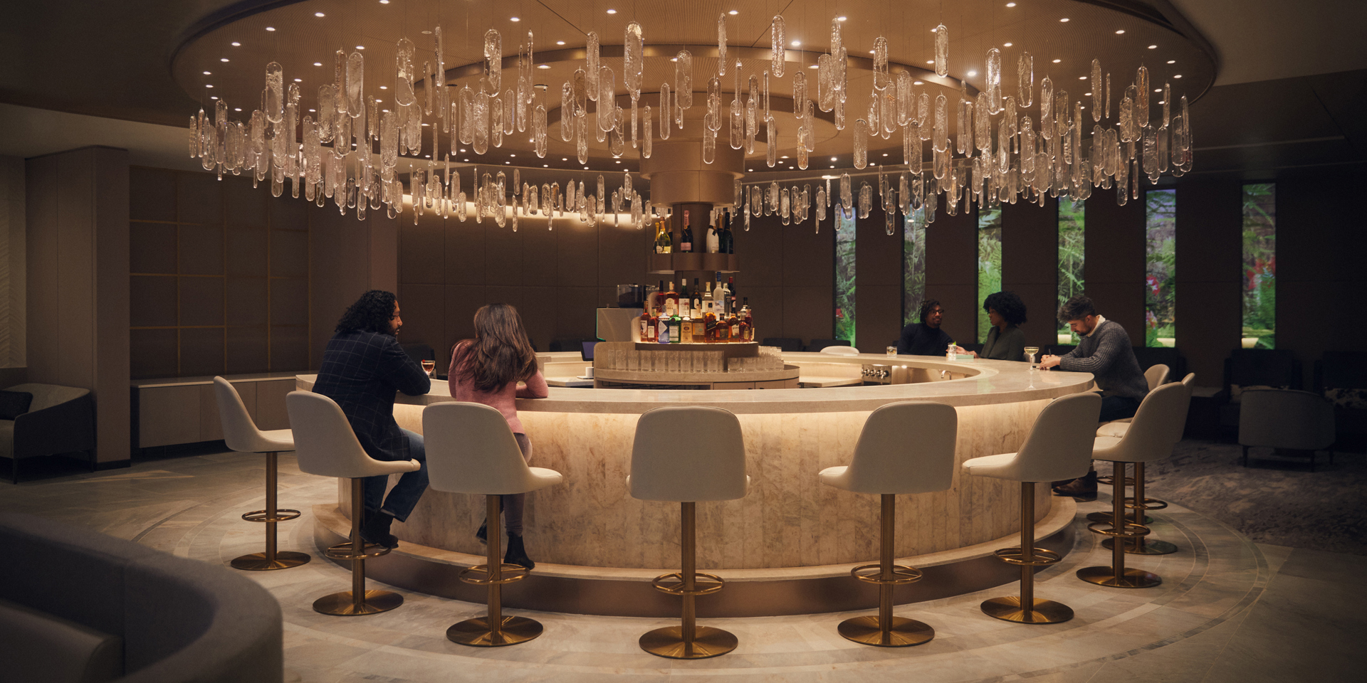 Enjoying a meal at the Club Lounge at Heathrow; Opening image: Champagne Bar in the Chelsea Lounge at JFK