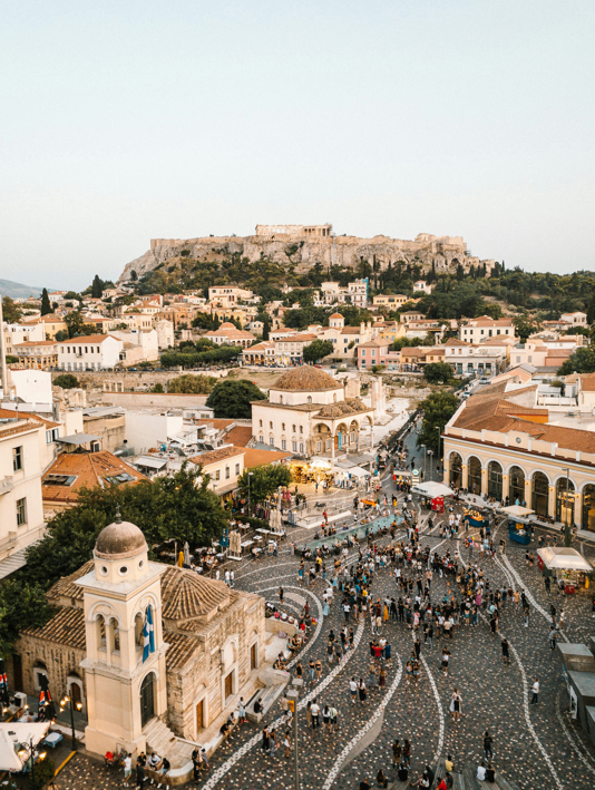 Athens’ famous Monastiraki Square with the Acropolis in the background (Andrea Leopardi); the Parthenon at the Acropolis (Thomas Chizzali)