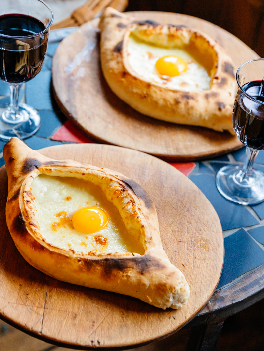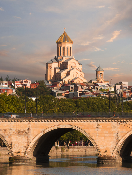 Saarbrucken bridge and Sameba Cathedral, Tbilisi, and traditional Georgian Khachapuri