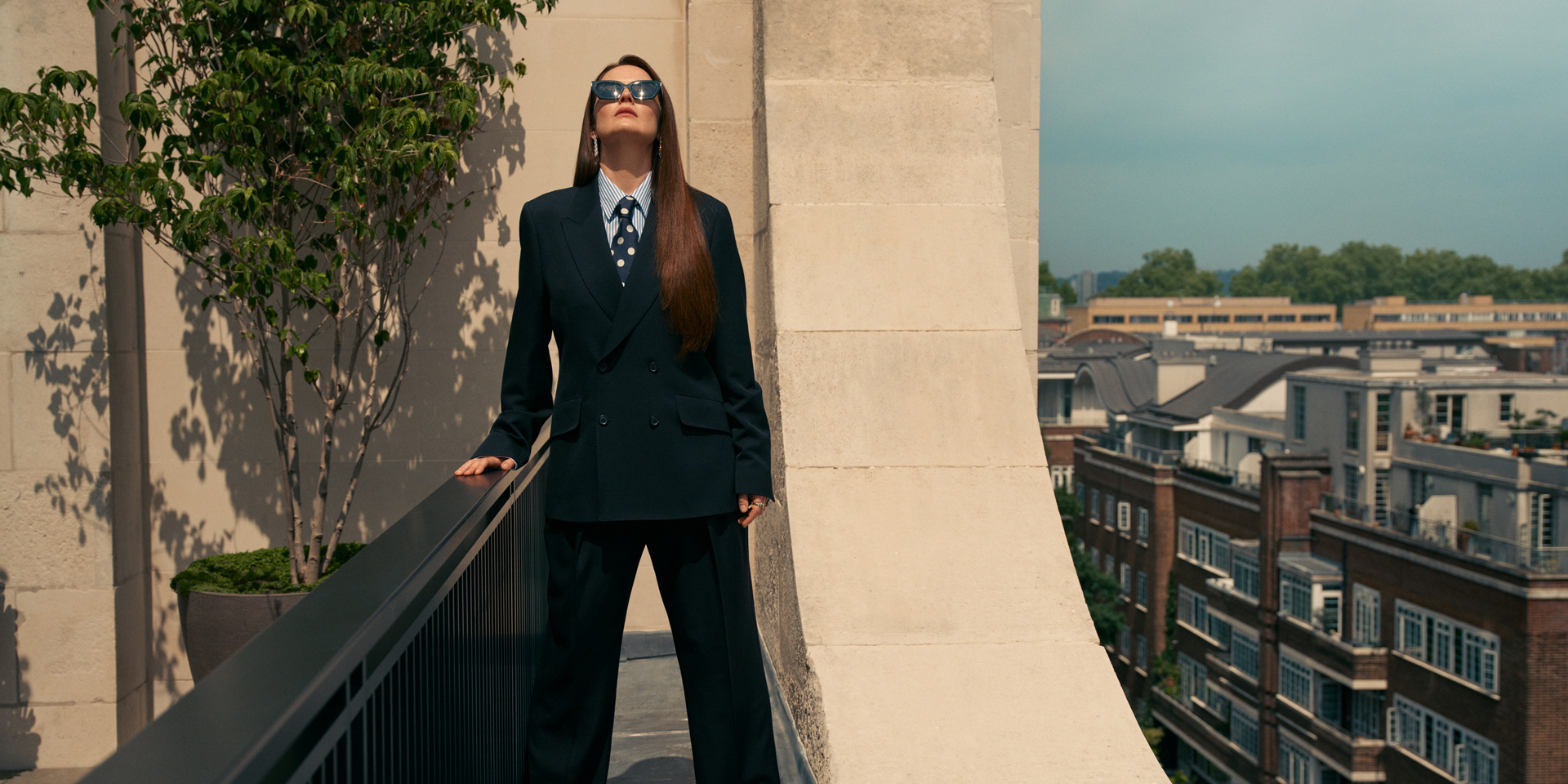 Roksanda Hidi jacket, £1,995, skirt, £1,495, and leather belt, POA; Lily Gabriella Fine Jewellery Supernova earrings, £23,250. Opening image: Paul Smith wool gabardine men’s double-breasted blazer, £1,300, men’s stripe cotton tailored fit shirt, £275; men’s wool gabardine wide-leg trousers, £460, and silk polka dot tie, £130; Lily Gabriella Fine Jewellery Aurea earrings, £17,280, and Naia tsavorite ring, £12,870; Saint Laurent by Anthony Vaccarello sunglasses, £340